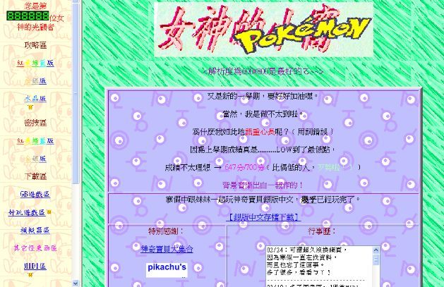後來網站作好了,不過可能一開始小弟做得還不好,成績並沒有很好。但這並沒有澆熄小弟作網頁的熱情,反而想把它做的更好。慢慢的,小弟破完許多不同版本的遊戲(順序到現在為黃、紅、金、銀、水晶、藍寶、火紅、綠寶、鑽石等,不包括修改版本),開始知道什麼是攻略,什麼是修改器、金手指,甚至自己開始寫攻略,並且把自己所發現的東西都作成網頁。也因為開始大量看網路語言,小弟在考到高中以前,學會了如何觀看/使用"火星文"(包含注音文、台灣國語、數字等,ㄣ...俗在4粉令郎懷念ㄉ一段過器ㄋ^ ^a)