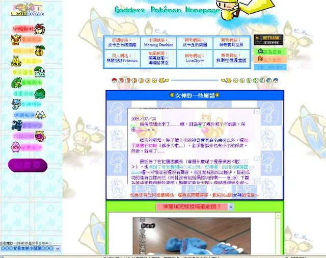 這次小弟來追悼....呃,是談談小弟的第一個網站,"女神的神奇寶貝小窩"。它最近在Yahoo!奇摩撤除個人網頁的風潮下,跟著其他的奇摩個人網頁一起銷聲匿跡了.........(默哀三分鐘)恩,默哀完了,那就聽聽這個網站的歷史吧~如果現在還不想睡覺,趕快按上一頁= ="