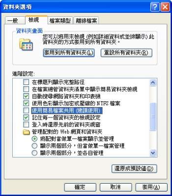 2.將檢視分頁中「使用簡易檔案共用」打勾選項取消,