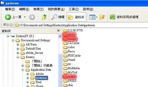 4.看看 (Drive):\Documents and Settings\(使用者)\Application Data\ppstream\ ,裡面會有PPS所屬的檔案,其中adsys、banner、notice與廣告有關,全部刪掉吧。(資料夾留著)